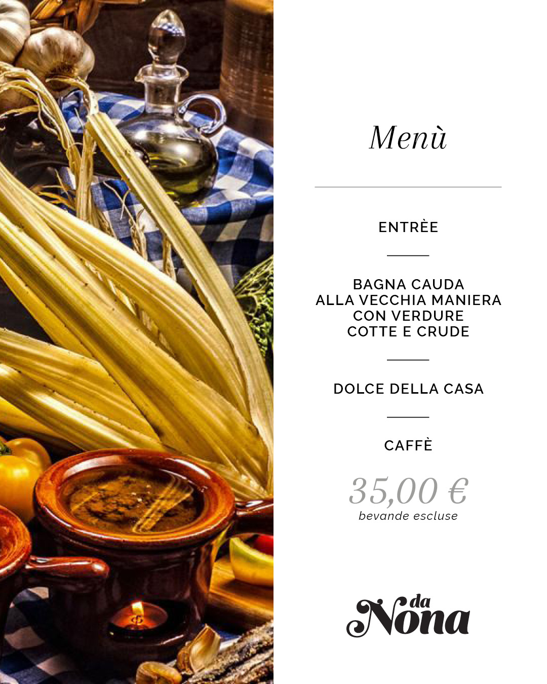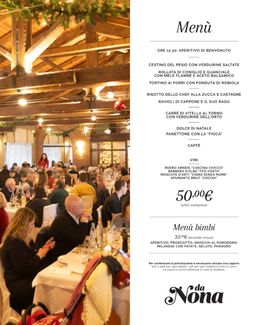 Scoprirai i sapori della nostra terra, in un viaggio culinario, dalla bagna cauda, al fritto misto Piemontese, alla carne alla brace con menu ALL YOU CAN MEAT del venerdi sera. Sabato 23 novembre potrai scatenarti alla cena animata “Call me Nona”, fino a festeggiare con noi il Natale e Capodanno.