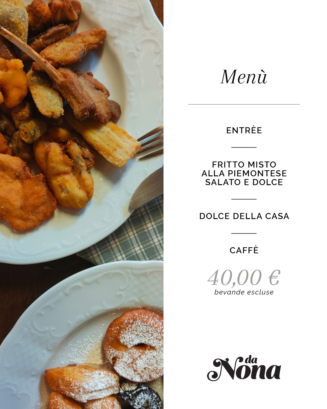 Come da tradizione, anche quest’anno, l’ospite d’onore della serata è il tuo amatissimo FRITTO MISTO ALLA PIEMONTESE, preparato il giorno stesso dalle Nonna Lucia seguendo la ricetta storica della sua famiglia.